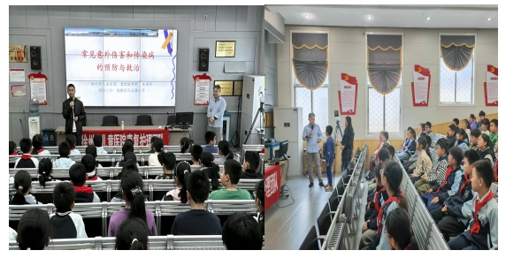 首先,来自儿童医院重症医学科的朱俊岭主任在集体教室进行了《常见意外伤害和传染性疾病的预防与救治》的PPT授课,授课内容丰富有益,图文并茂。朱主任用他丰富的临床经验和风趣幽默的授课方式向学生们传递着健康知识。现场,同学们气氛活跃,和朱主任互动频繁,对于积极回答问题,课堂表现突出的同学给予奖励。