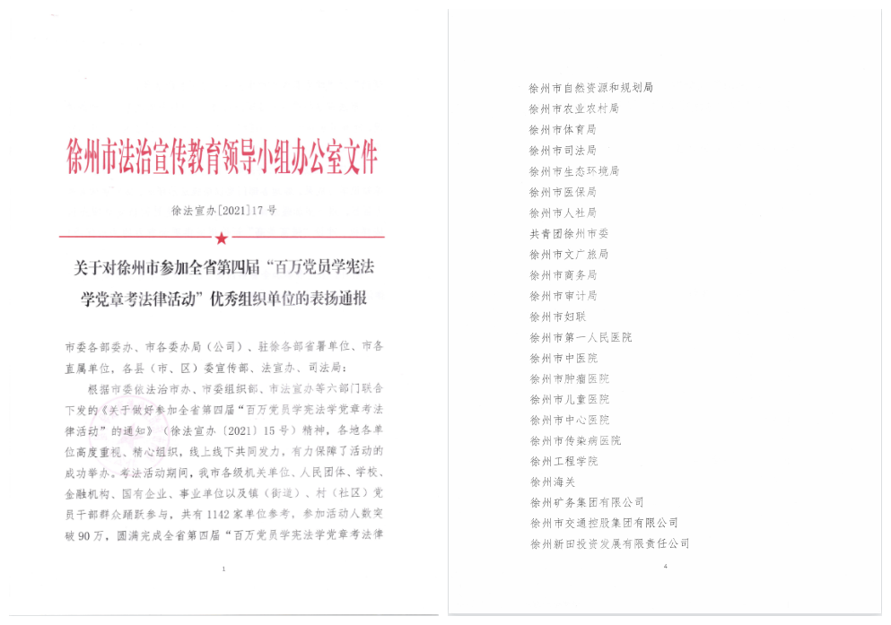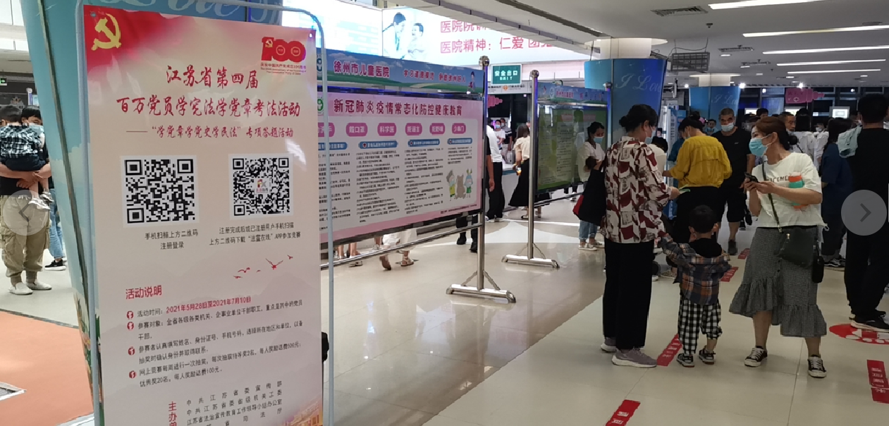 为庆祝《中华人民共和国民法典》颁布一周年,结合中国共产党成立100周年“永远跟党走”主题宣传教育活动的安排,按照徐州市卫生健康委员会转发的徐州市委全面依法治市办公室等六部门联合下发的《关于做好全省第四届“百万党员学宪法学党章考法律活动”的通知》(徐发宣办[2021]15号)要求,院法治办组织全院干部职工参加第四届“百万党员学宪法学党章考法律活动”之“学党章学党史学民法”专项答题活动,为方便群众和职工参与答题活动,医院共制作6张宣传海报分别张贴在外科大楼门诊、内科大楼门诊、急诊大厅、门诊药房、门诊一站式服务台、门诊自助挂号机处。据统计,此次专项答题活动医院干部职工参与人数近600人,在全市卫生系统名列前茅,获得了徐州市法治宣传教育领导小组办公室通报表扬,获得了徐州市参加全省第四届“百万党员学宪法学党章考法律活动”优秀组织单位名称。
