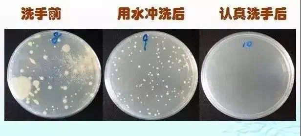 我们做了个实验来验证。首先对从公共场所回来的人的手进行涂抹采样,然后让她用水冲手后,再采一个样,最后用香皂认真清洗、擦干后,再采一个样。结果呢?不洗手的话,培养基上可以看到大片的菌落,手经过流水冲洗后,菌落数少了一些,但还是有很多;用香皂认真洗手并擦干后,肉眼看不到细菌生长!