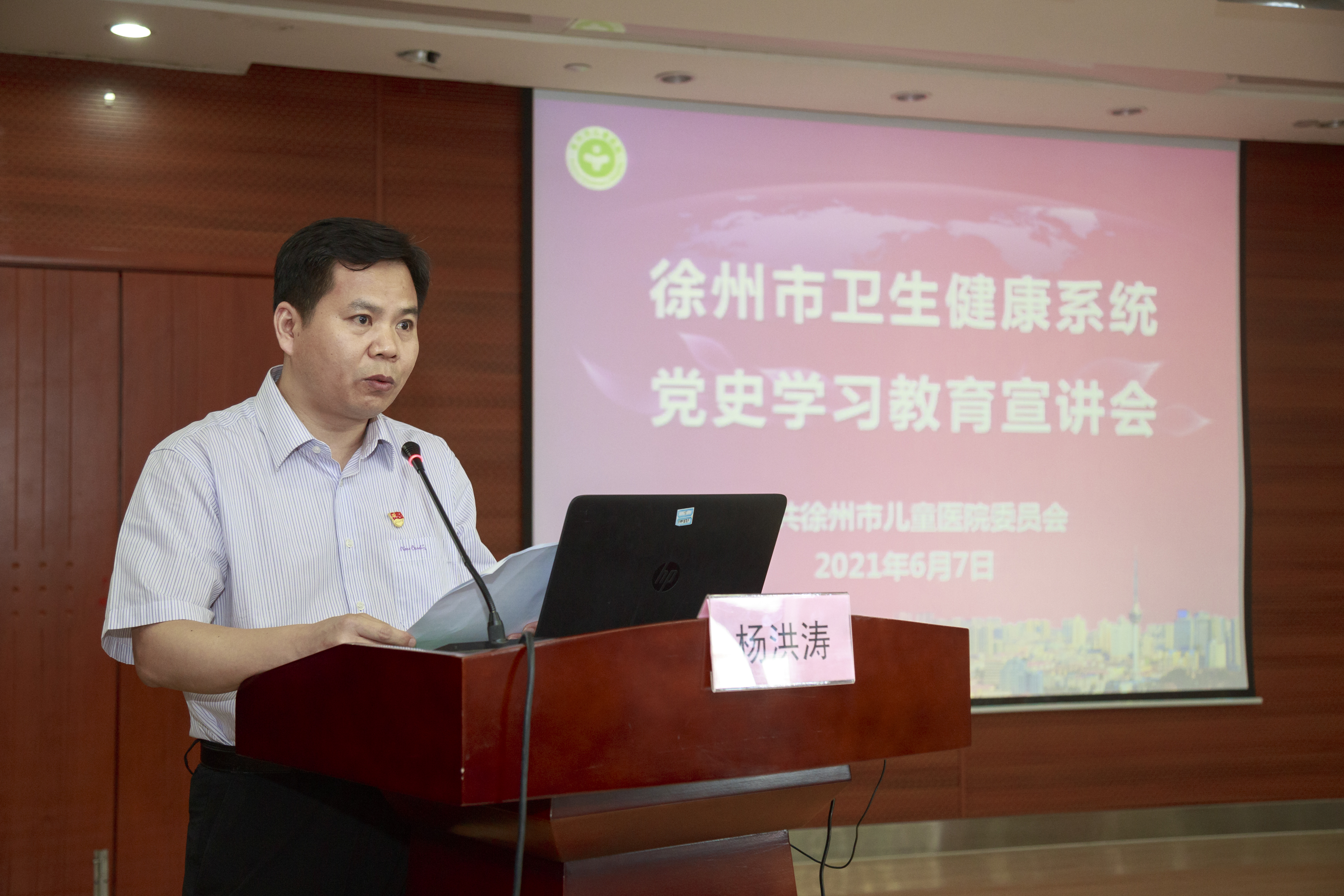 2021年6月7日,徐州市卫健委系统党史学习教育巡回宣讲第二站走进徐州市儿童医院。在徐州市卫健委四级调研员杨洪涛的带领下,6位来自医疗系统优秀的医务工作者走进2号楼八楼会议室,为150余名市儿童医院党员干部进行精彩纷呈的党史学习教育宣讲。