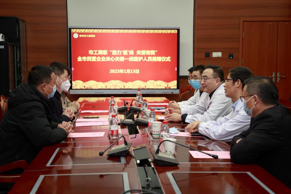 2023年1月13日下午,由徐州市工商联组织的“助力‘医’线、关爱有我”活动走进我院。徐州市工商联党组成员、市总商会党委书记杨伯胜一行人员来到我院,代表市工商联及全市民营企业为一线医护人员送来了慰问金,我院党委书记田明代表全院医护人员对徐州市工商联的爱心捐赠表示了衷心的感谢,并表示全院医务人员一定牢记医者初心,在国家疫情防控政策调整之后集全院之力,积极收治新冠阳性患儿,充分体现我院全心全意为患儿服务的宗旨,以实际行动践行“敬佑生命、救死扶伤、甘于奉献、大爱无疆”十六字精神。