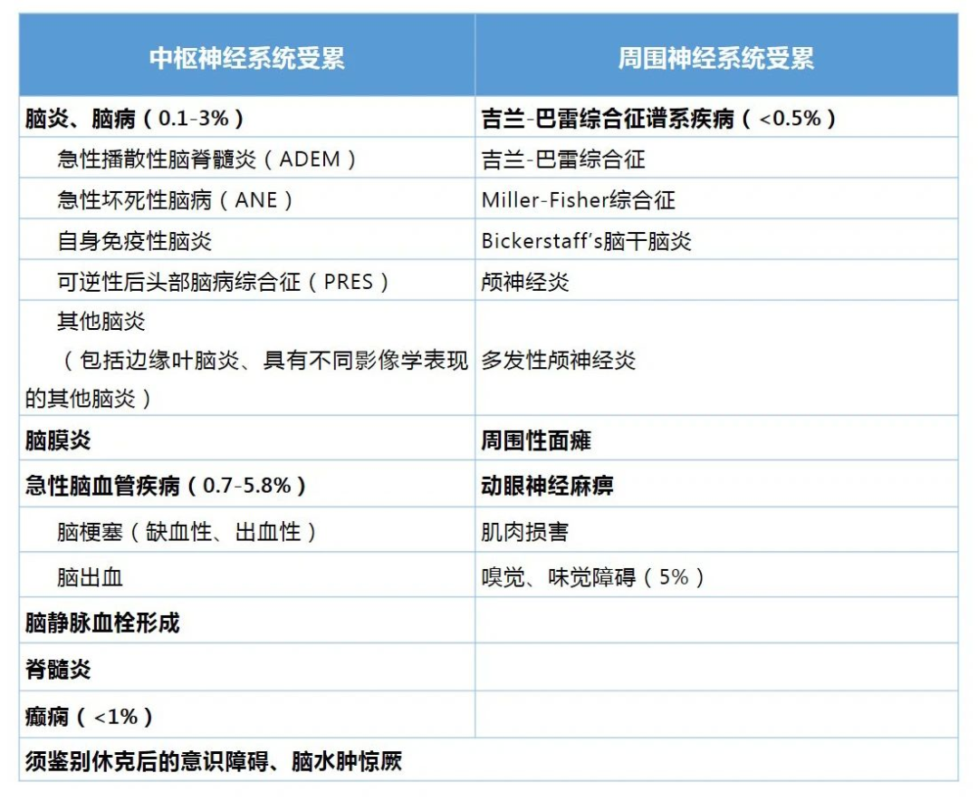 与感染其它毒株相比,抽搐/惊厥可能更常见于感染Omicron变体的儿童,据报道,住院患儿发生率可达20%。可发生在典型的热性惊厥年龄(6月龄~5岁)范围外的儿童中。在神经系统受累的患者中,12%的患者出现了危及生命的情况,包括严重的坏死性脑病、卒中和中枢神经感染/脱髓鞘等。