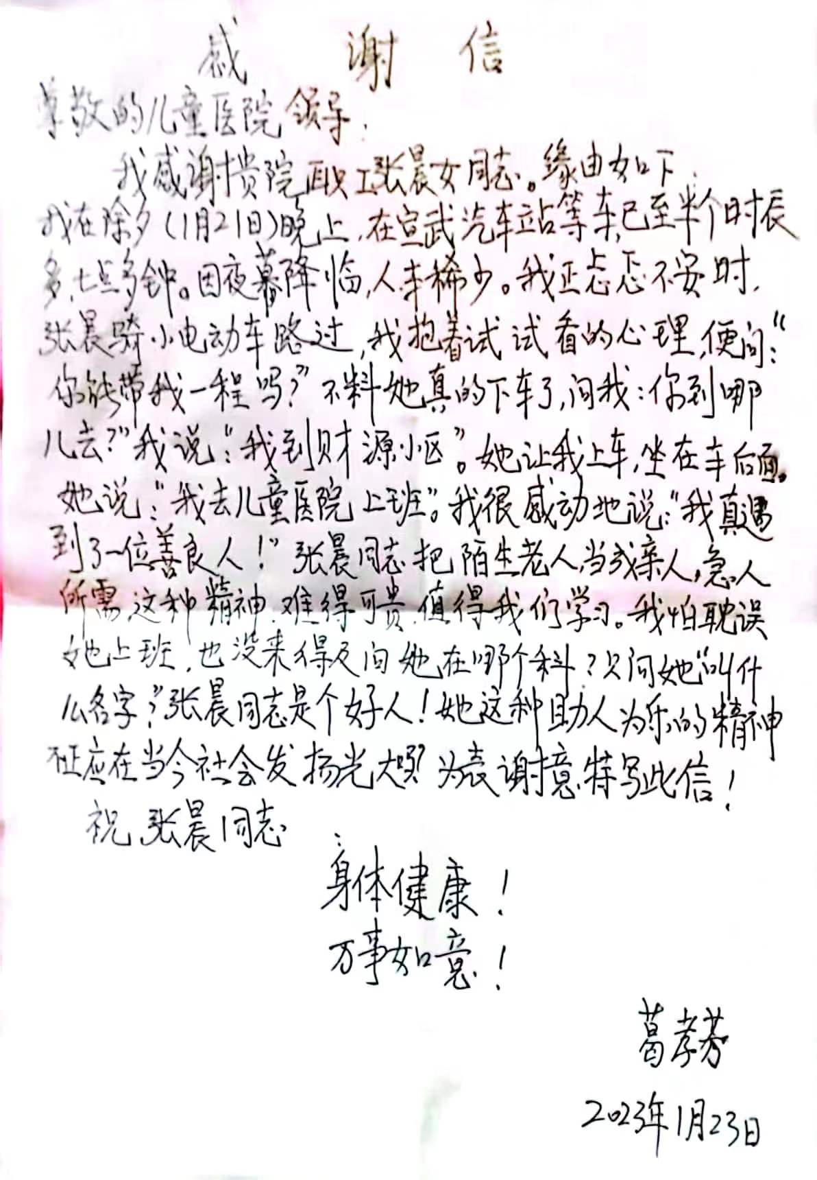 这两天,在徐州市儿童医院职工微信群,一张表扬信和一条寻人启事引起了大家的关注。原来是一位80岁的葛孝芳老太太手写了一封感谢信表扬儿童医院的张晨同志。收到感谢信的院办同志因找不到张晨同志才发在职工群寻人。最终经核实,原来是医学影像科的张晨晨同志。