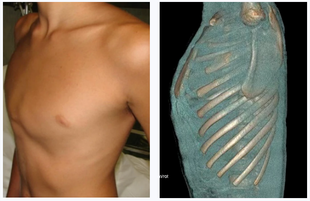 鸡胸其特征是胸壁前凸突出,又称船状胸、鸽胸等,发病率仅次于漏斗胸,为第二常见的胸壁畸形,男女比例为4:1。