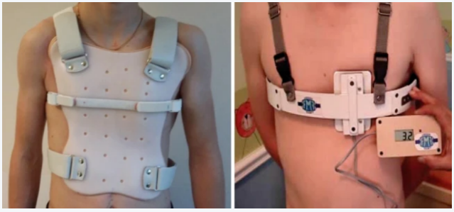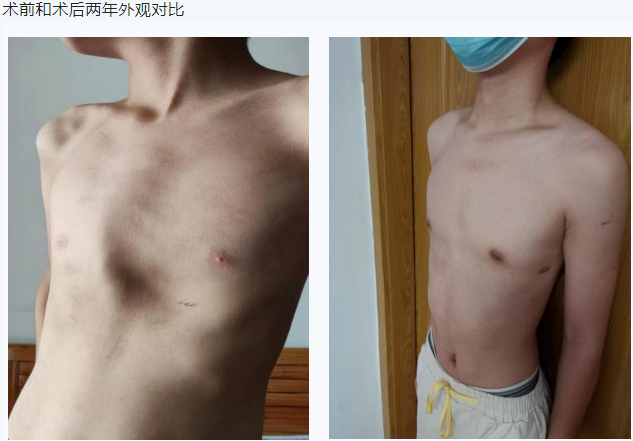 2.鸡胸是缺钙引起的吗? 鸡胸的病因至今尚不完全明确,有学者认为鸡胸发病多与钙磷代谢有关。目前更多提出的发病机制:与基因相关的肋软骨发育异常、肋软骨生化异常。约30 %的人群有鸡胸家族史,高达15 %的患者中,与脊柱侧凸和其他脊柱畸形也有很大的相关性,提示存在机体结缔组织疾病。所以鸡胸不能单纯地归因于缺钙。 3.鸡胸多发于哪个年龄段? 鸡胸在出生时很少见,它通常在儿童期出现、发展,并在青少年早期变得明显。 4.鸡胸有什么影响? 多数患儿无明显的临床症状,仅因外观问题就诊。特别严重的鸡胸表现的症状为:劳力性呼吸困难、运动受限、频繁的呼吸道感染和胸部不适或疼痛。 5.鸡胸通过运动能改善吗? 关于运动疗法已逐渐达成共识:运动治疗在个体鸡胸的效果上并无改善。一般来说,运动尤其是游泳,健美运动可以掩盖畸形。然而,在16岁或18岁之前不推荐使用此法。 6.除了做手术,鸡胸可以保守治疗吗? 鸡胸支具矫形系统———通过佩戴定制的合适的支具,在患儿胸部上施加压力,通过长时间对畸形施加连续的直接压力,使得肋软骨能够重塑。胸壁顺应性好的患儿对这种治疗最为敏感;因此,最好青春期前儿童。因为需要长期佩戴,这种保守治疗的局限性在于患者的年龄及其依从性,很大比例的患者放弃了治疗。
