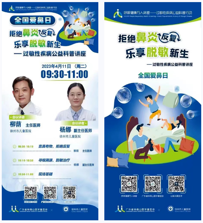 您家的宝贝鼻子还好吗? 过敏性鼻炎通过正规的治疗是可控的,其中过敏原特异性免疫治疗(脱敏治疗)是目前唯一有可能通过免疫调节机制改变疾病自然进程的治疗方法,目前我国儿童只有螨虫有标准化的脱敏治疗——包括舌下含服法脱敏和皮下注射法脱敏,有研究表明,对尘螨脱敏有效的患儿,对其他过敏原的敏感度也会大大降低。 每年的3-4月份是过敏性鼻炎等鼻部疾病的的高发季节,为了提高家中有鼻部过敏症状患儿的家长重视,借着“全国爱鼻日”来临之际,我们本着服务广大患儿的热情,徐州市儿童医院耳鼻咽喉头颈外科于4月11日上午特面向全社会开展“儿童过敏性疾病公益科普讲座”活动 ,本次的主题是“拒绝鼻炎反复,乐享脱敏新生”。届时由科主任、学科带头人柳荫主任坐镇,带领其医生团队成员杨娜副主任医师共同为广大鼻炎患儿现场义诊、答疑。