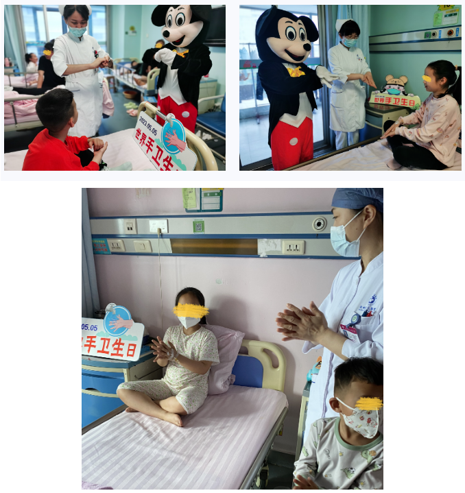 随后,护理团队来到了病房,感控护士化身米奇来到孩子们床旁,逐一讲解、示范手卫生操作,孩子们见到米奇到来格外兴奋,学习手卫生时自然格外的认真!