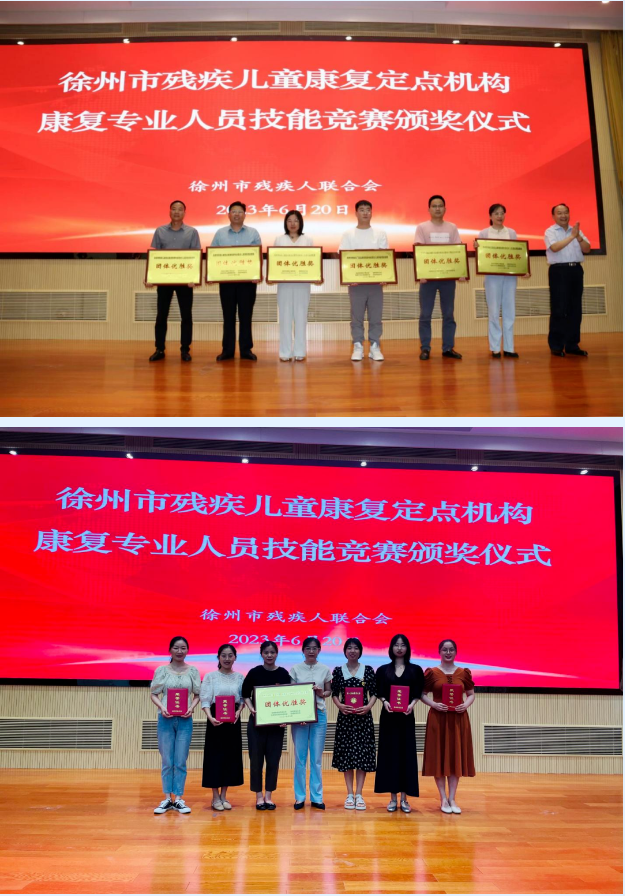 此次竞赛活动分为肢体(脑瘫)和孤独症两个类别,每个类别均由理论考试和实践操作两部分构成,吸引了来自全市43家机构参赛。经过紧张的理论初赛,我院康复科两组类别队伍6名康复治疗师以优异的成绩脱颖而出进入决赛。决赛中,治疗师团队客观准确评估患儿,巧妙设计训练方案,沉着应试,默契配合,体现了ICF架构下团队协作、精准康复的理念。经过激烈角逐,最终获得了多项荣誉,展现了我院康复治疗师的团队风采。 在生机蓬勃,色彩斑斓的盛夏时节,我院康复科团队在此次竞赛活动中硕果累累,收获颇丰,展现了我院康复科的团队实力和强劲的发展势头。一份荣誉一份责任,我们将不断汲取新理念、新知识、新技术,打造规范化的儿童康复诊疗中心,逐步建立覆盖淮海经济区的三级儿童综合康复体系,造福特殊儿童。 科室主要业务范围: 康复科主要收治小儿发育障碍性疾病及各类疾病造成的功能障碍:脑损伤高危儿、运动发育迟缓、语言发育迟缓、孤独症谱系障碍、脑性瘫痪、智力发育迟缓、吞咽障碍、各类疾病造成的脑损伤(如脑炎、脊髓炎、脑外伤、脑肿瘤术后、癫痫术后、颅脑外伤等)、周围神经损伤(如面神经麻痹、臂丛神经损伤、腓总神经损伤等)、各类神经系统慢性疾病的康复(如脊髓性肌萎缩、进行性肌营养不良等)、骨科相关畸形及骨折术后、遗传代谢性疾病及染色体、基因病等。 科室特色诊疗项目: 1、高危儿诊断和治疗 2、语言发育迟缓诊断和治疗 3、孤独症儿童早期综合干预模式 4、磁刺激神经调控治疗 5、肉毒毒素注射治疗 6、吞咽功能训练、吞咽障碍球囊扩张术 7、视觉康复 8、中医特色诊疗 9、儿童体型体态异常综合防控体系 康复科门诊坐诊时间