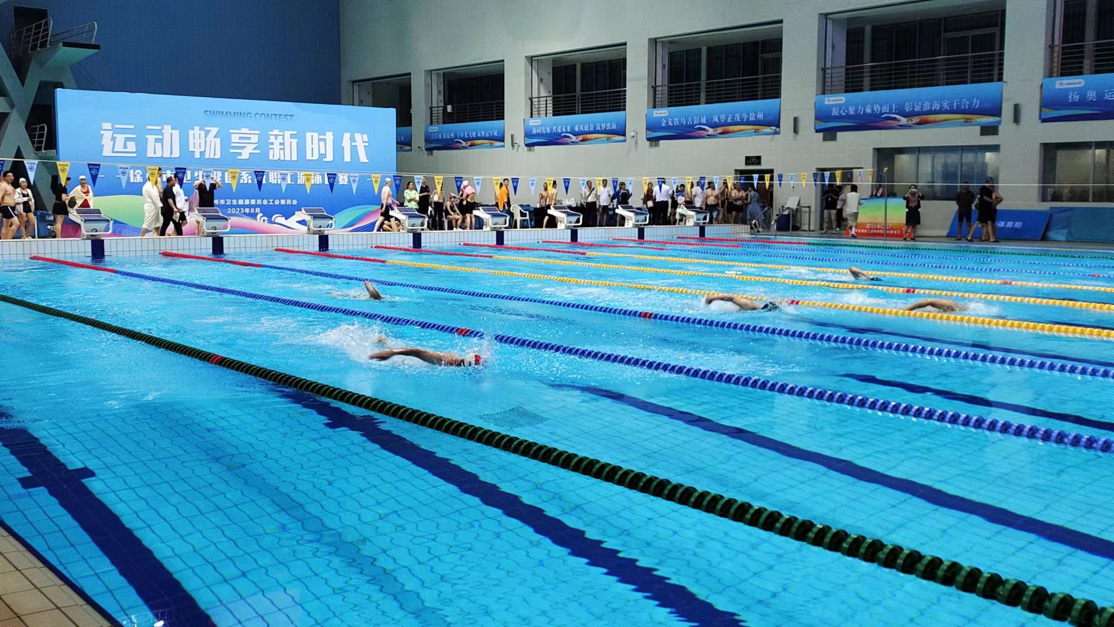 为了充分展现卫生系统职工的精神面貌,丰富职工的业余文化生活,由徐州市卫生健康委工会举办的“运动畅享新时代”职工游泳比赛于2023年8月27日在市奥体中心游泳馆激情开赛,来自卫生系统18家单位,近200名选手参加比赛。