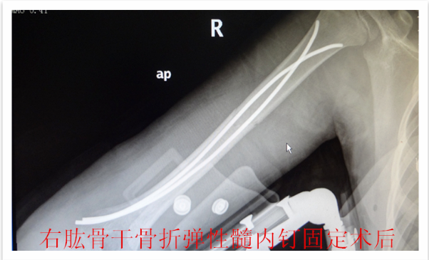 儿童四肢骨折较为常见,保守治疗仍是儿童骨折的重要 治疗方法之一,如牵引,单纯石膏固定等。 往往用时较长,患儿的舒适程度不够,影响患儿及时返回学校学习,这些因素越来越多地影响儿童骨折治疗方法 的选择 。儿童骨折手术治疗的比例较前增加,而传统的手术治疗创伤大,恢复慢,并发症多,如钢板,那是针对成人骨折研发的,用一个坚硬的内固定物固定一个有弹性的骨组织是一个矛盾 ,弹性髓内钉内固定解决了这个矛盾。有人说,弹性髓内钉的出现是上天对儿童的恩惠。的确,弹性髓内钉是治疗小儿长管状骨骨骨折的一种理想、可靠的内固定方法。弹性髓内钉技术发源于法国,在欧洲广泛应用后,现已为全球所接受,被称为是儿童骨科界的一次革命。徐州儿童医院骨一科应用弹性髓内钉技术治疗四肢长管状骨骨折,具有创伤小、恢复快、并发症相对少,孩子能较快恢复正常生活、学习等优点。该技术先将骨折闭合复位,通过微小的切口将特制的弹性髓内钉置入骨髓腔,达到固定骨折的目的。适用于肱骨,股骨,尺桡骨等部位的常见骨折(图)。