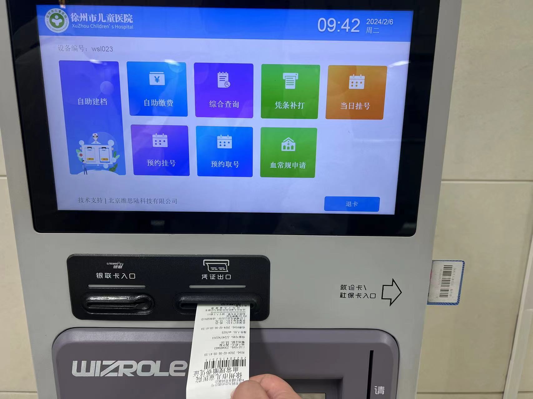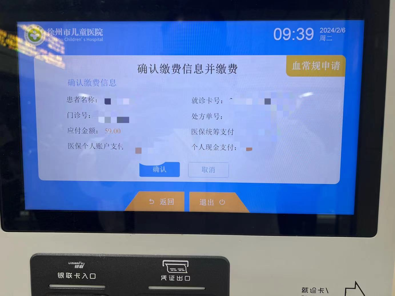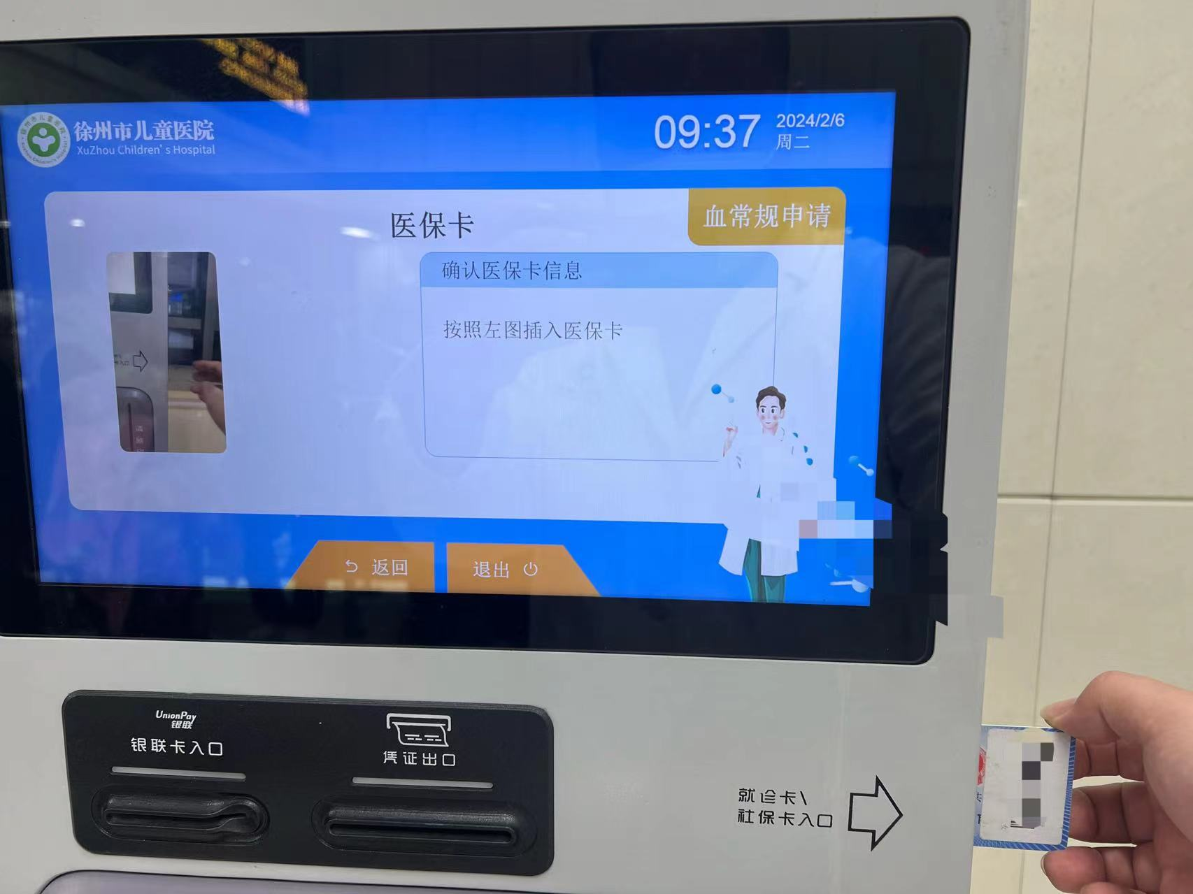 6.缴费成功后,请取走缴费凭条与医保卡,后将缴费凭条交由化验室工作人员进行抽血检查,如图所示: