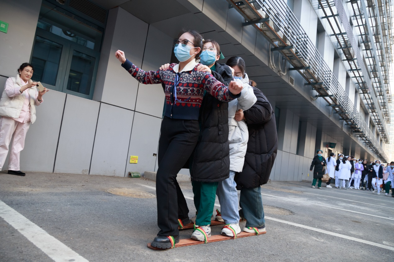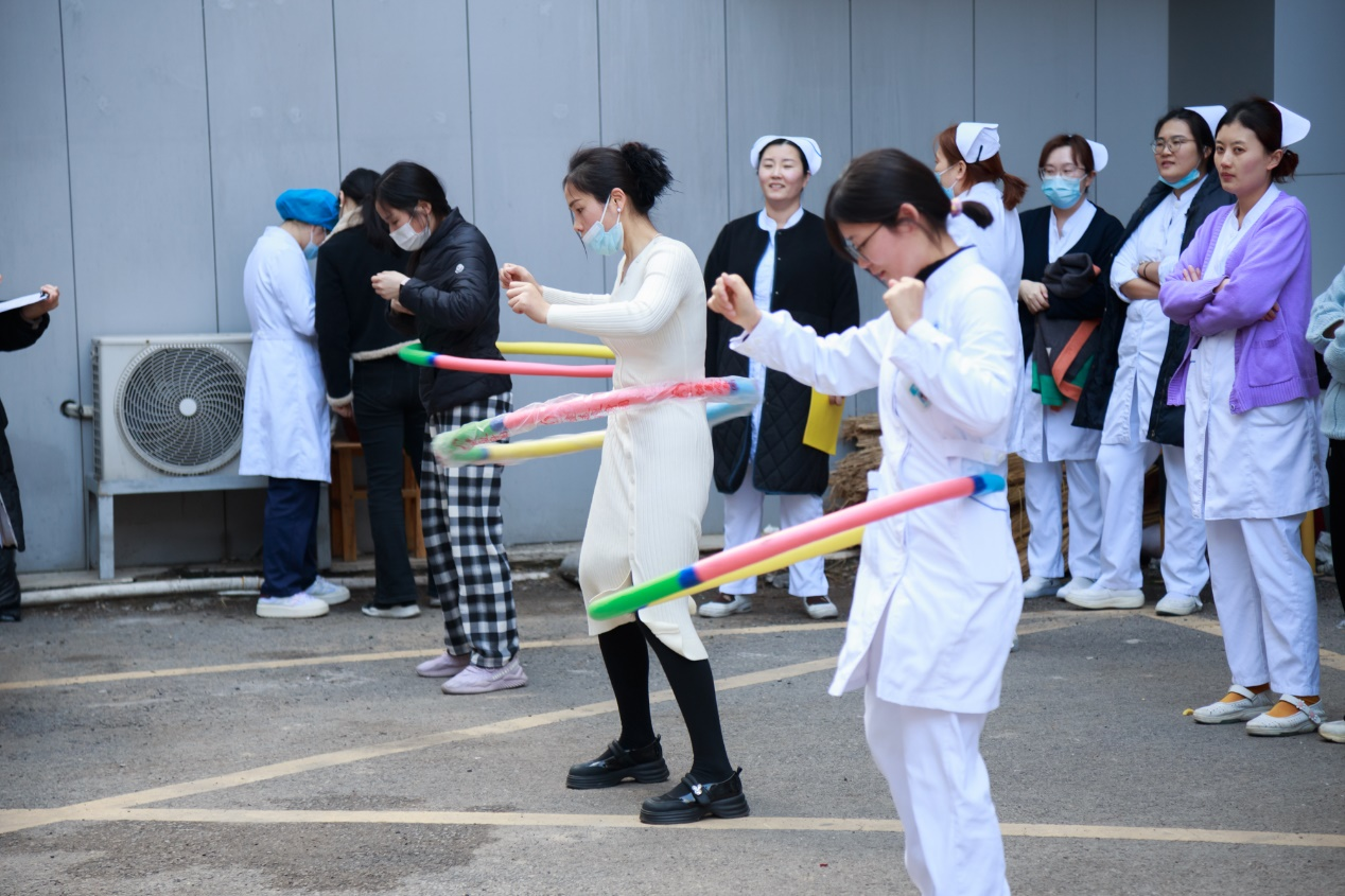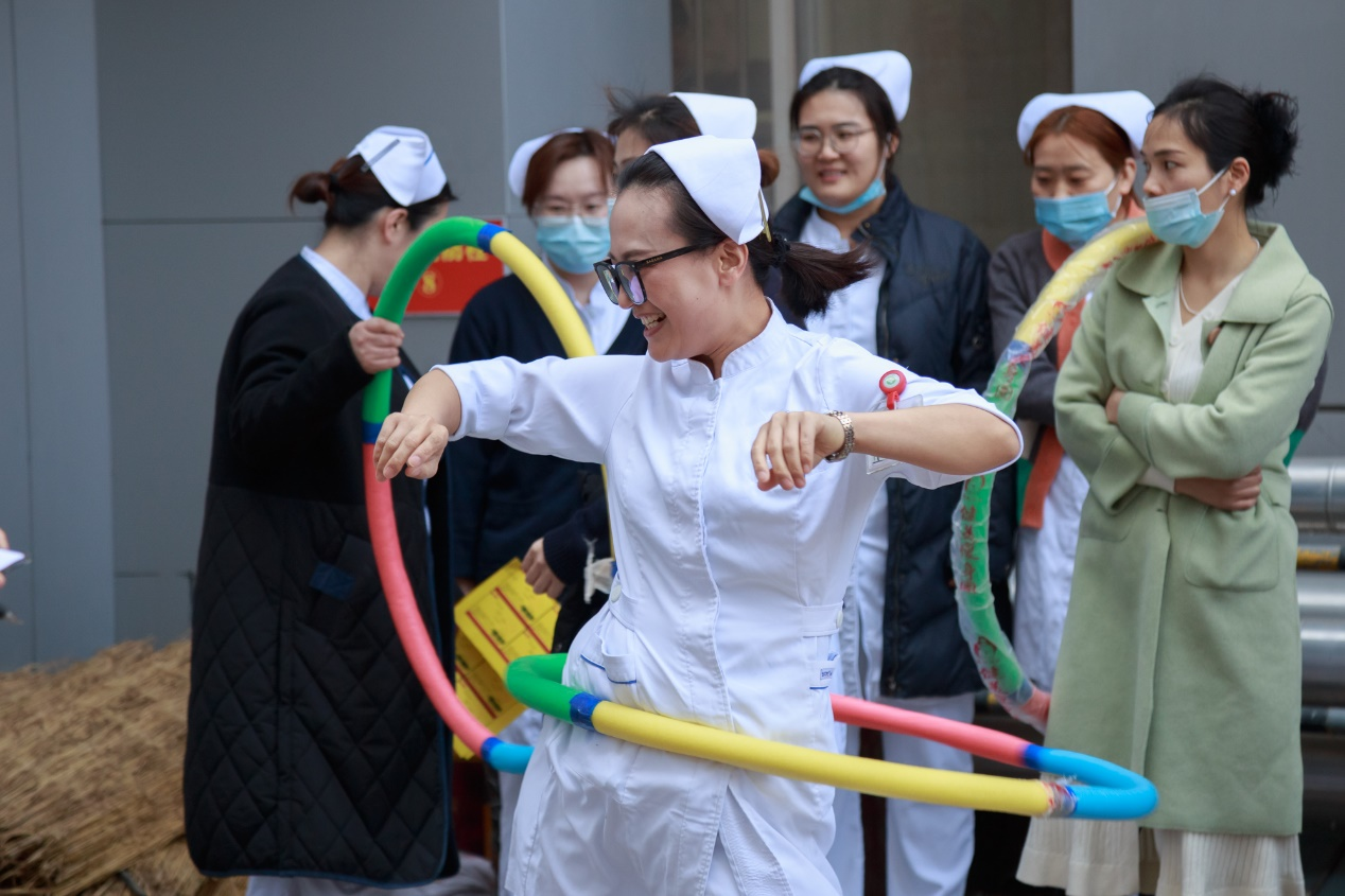 活动设团体项目--同舟共济、个人项目--转呼啦圈、娱乐项目--原地踏步不出圈。经过一个多小时的激烈角逐,由骨科、普外科、新生儿外科组队参加的同舟共济团体赛获得第一名。