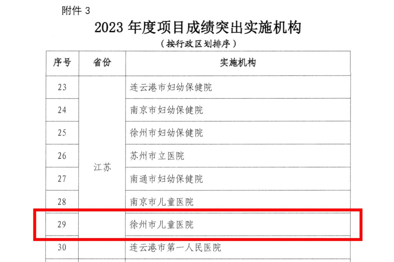 2024年3月18日,国家卫生健康委印发《关于2023年出生缺陷干预救助项目进展情况的通报》,徐州市儿童医院获得“2023年项目成绩突出实施机构”荣誉称号。