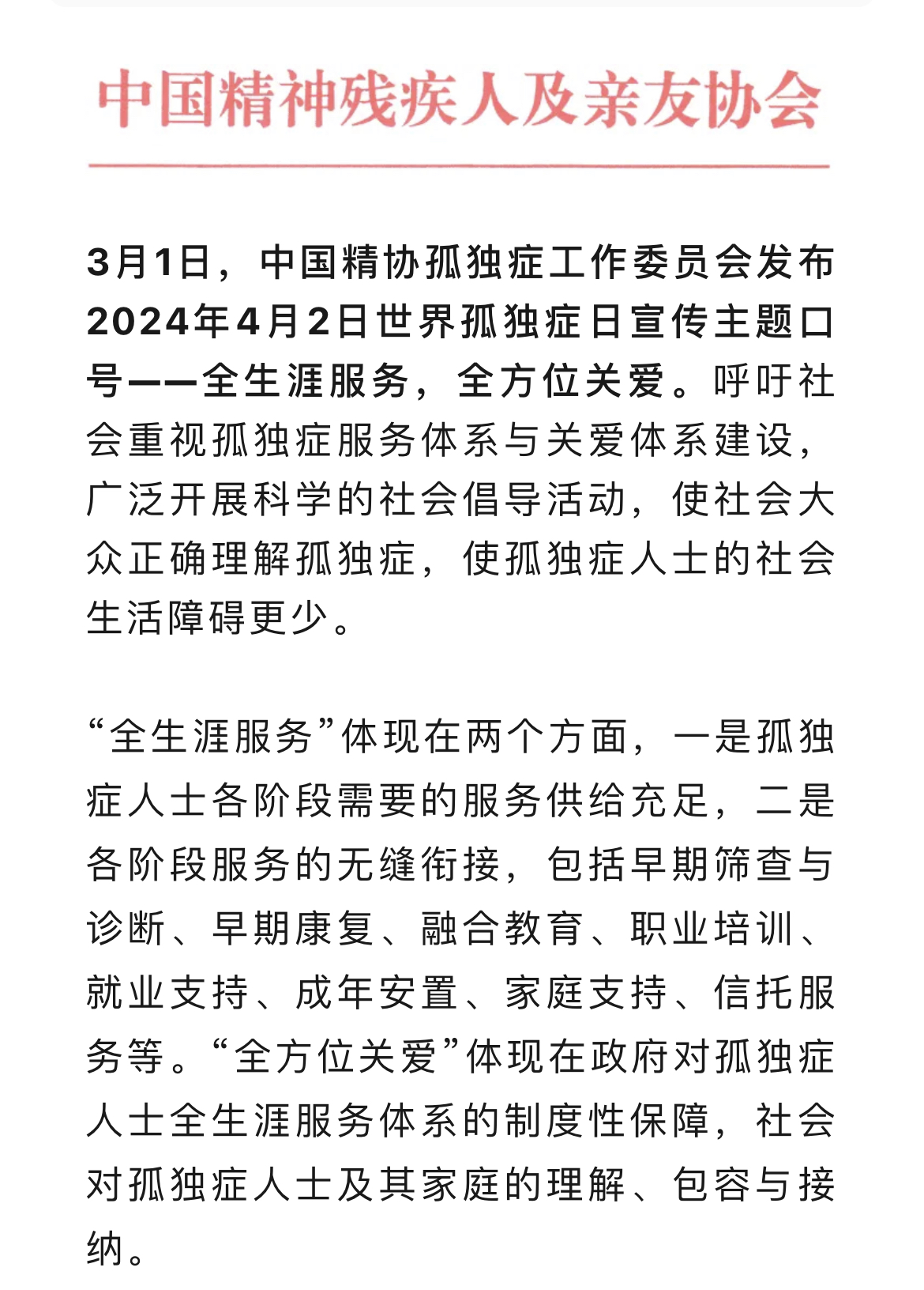 孤独症(自闭症),一种神经发育障碍疾病,影响着全球数百万儿童的生活。自2007年联合国大会指定4月2日为世界提高孤独症意识日以来,联合国一直将这一天作为一种手段,以确认和促进孤独症患者在与其他人平等的基础上,充分实现所有人权和基本自由。2024年4月2日是第十七届世界孤独症日,今年的宣传主题是:“全生涯服务,全方位关爱”。