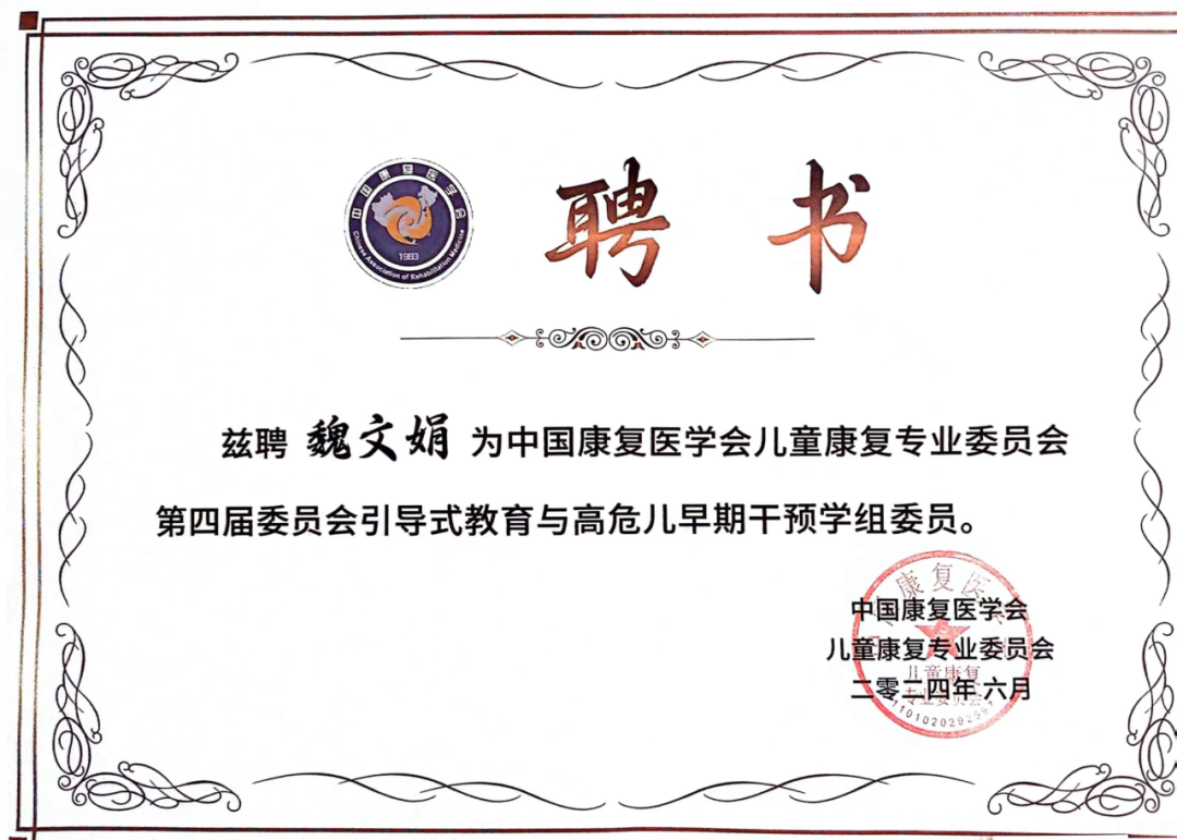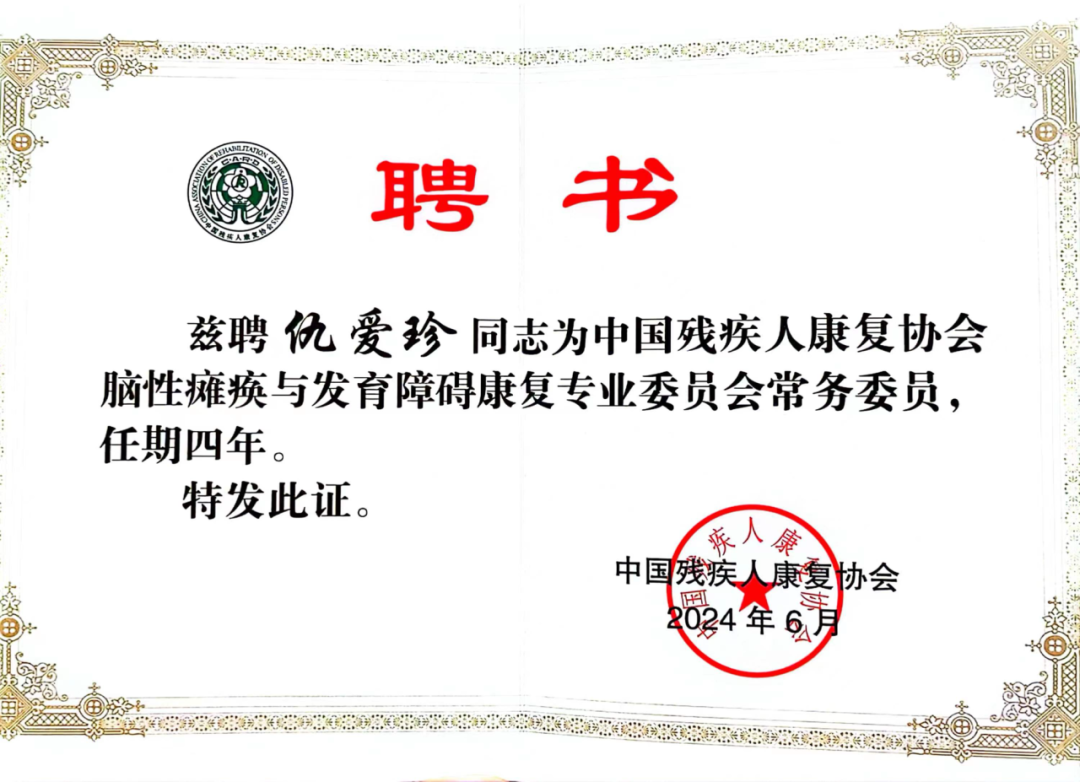 在本次全国年会中,我院康复科主任仇爱珍在孤独症谱系障碍康复论坛中担任主持人,同时仇爱珍主任被聘为中国残疾人康复协会脑性瘫痪与发育障碍康复专业委员会常务委员,治疗师魏文娟被聘为中国康复医学会儿童康复专业委员会第四届引导式教育与高危儿早期干预学组委员。