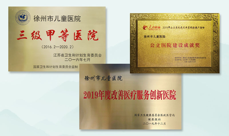 目前,医院是国际儿童生命支持技术标准化医院,多次被评为国家卫健委改善医疗服务先进典型示范医院、江苏省文明单位、徐州市文明单位。