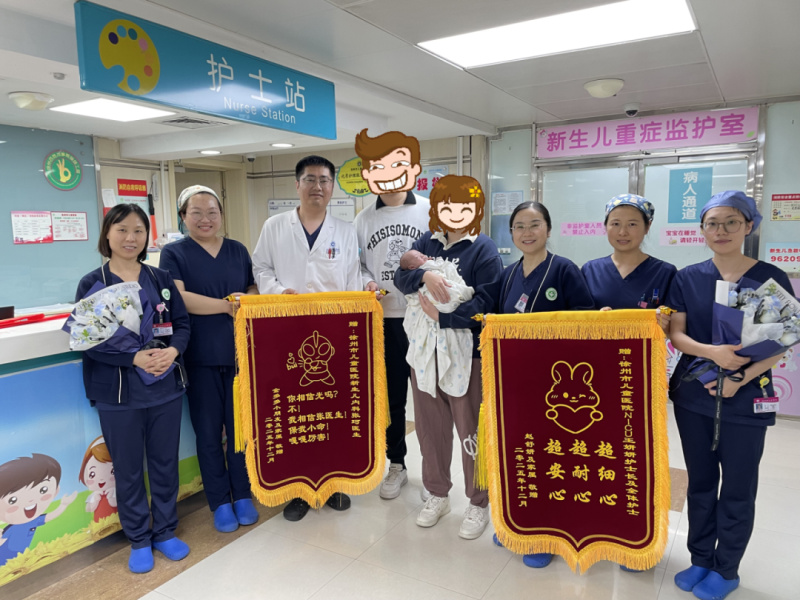 2025年12月29日下午,徐州市儿童医院新生儿内科医生办公室迎来了一位特殊的访客——患儿多多的妈妈赵舒妍。她手捧两面锦旗与鲜花,眼含泪水,激动的将其中一面特别定制的锦旗郑重地交到管床医生张珂手中。锦旗上印着一个酷炫的奥特曼,下方写着一段风趣又真挚的话:“你相信光吗?不!我相信张医生,保我小命,嘎嘎厉害。”看似俏皮的话语,背后却藏着一段惊心动魄又温暖人心的早产儿救治故事。