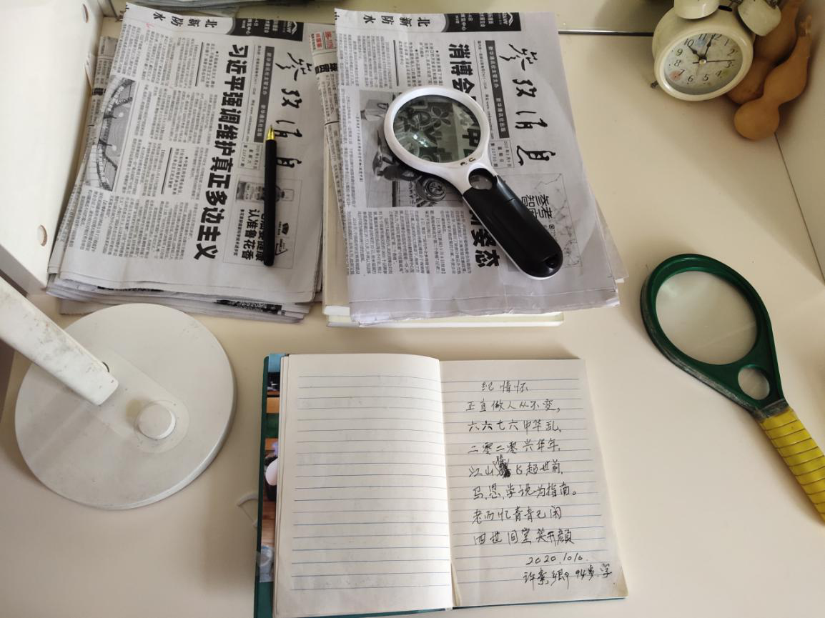 许老10岁加入儿童团,18岁加入中国共产党,祖国哪里有需要,她就去哪里。半生时光,她始终奔波在路上,奋斗的足迹,踏遍了大半个中国。如今,许老虽然已经95岁,可是她仍旧保持着读书看报的优良习惯。放在书桌上的《习近平新时代中国特色社会主义思想》已经看的很旧了,《从两个大局出发思考处理问题》的文章,许老读了很多遍,依然爱不释手,索性把报纸剪下来,贴在自己的笔记本上,每天阅读。许老与我们交谈中一直在说:“是党和人民培养教育了我,希望我们的党、我们的国家越来越好。”