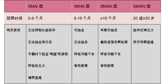 根据发病年龄以及可达到的最大运动里程碑可以将SMA分为以下型别4: